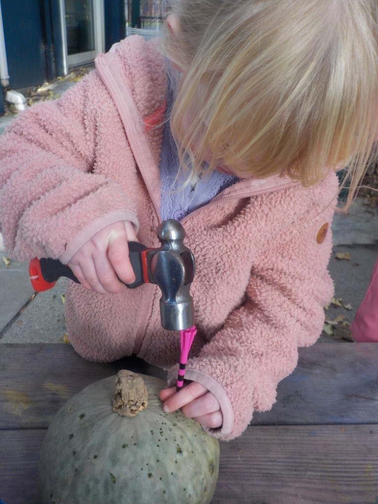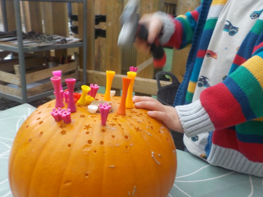 Sorrel has been modelling to the children in how to use the hammers, building up their confidence and experience in using tools safely – by starting off with golf tees rather than nails!