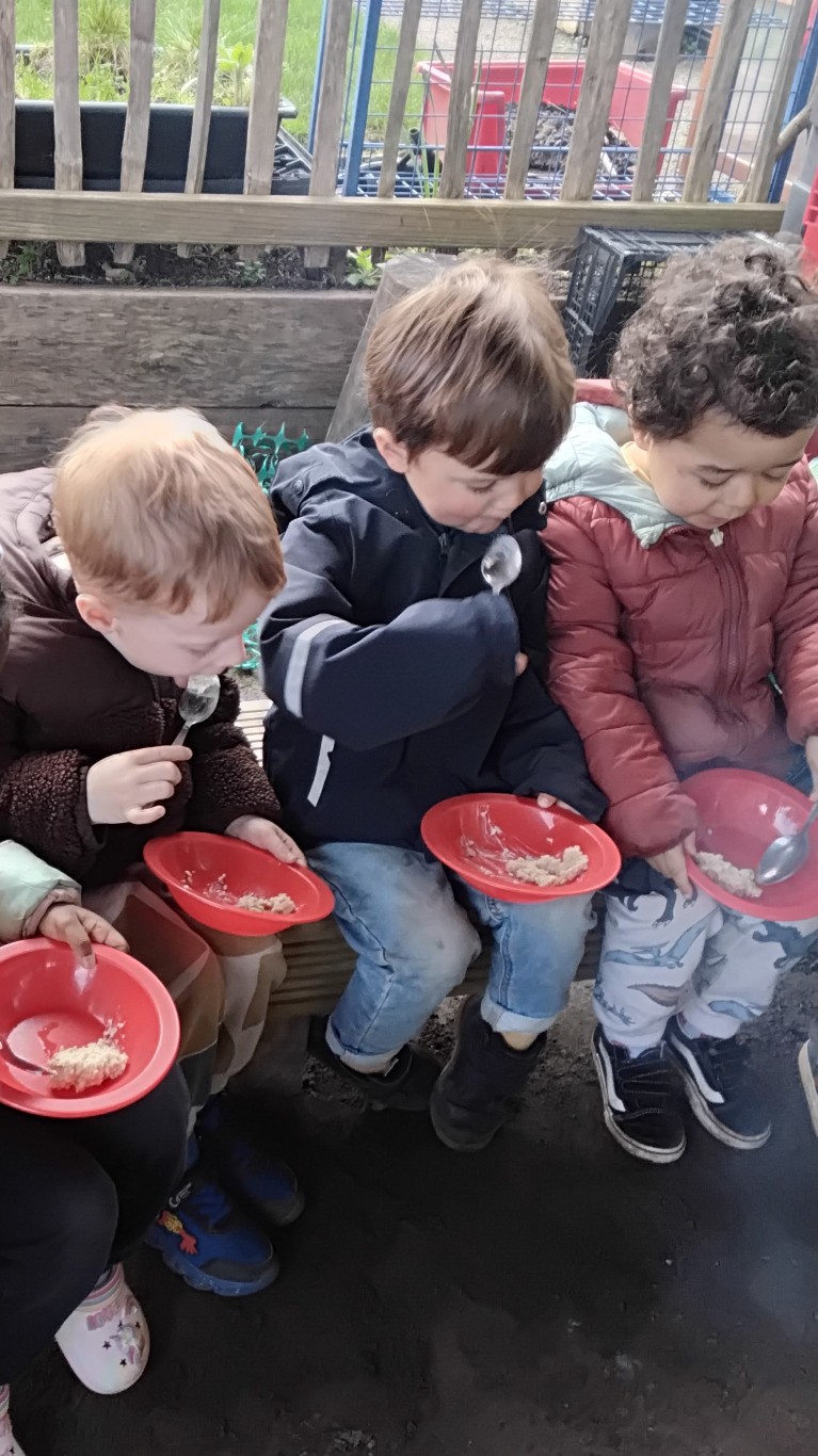 We have been busy cooking porridge over the fire—salty like Daddy Bear’s, sweet like Mummy Bear’s, and plain like Baby Bear’s.